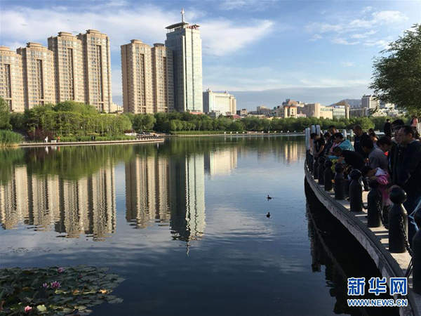 市民在烏魯木齊南湖市民廣場(chǎng)的湖邊欣賞野鴨(6月4日攝)。新華社記者 符曉波 攝