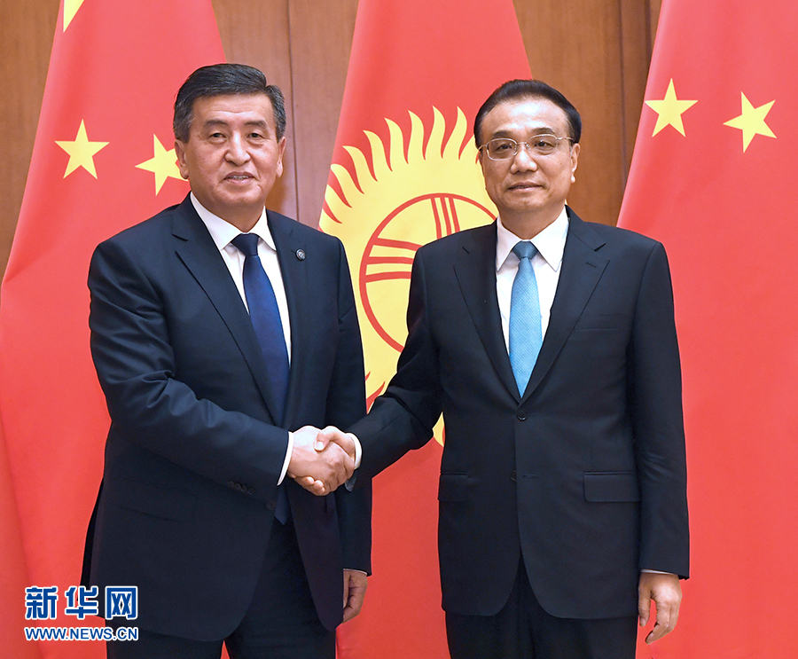 6月7日,國(guó)務(wù)院總理李克強(qiáng)在北京釣魚臺(tái)國(guó)賓館會(huì)見(jiàn)來(lái)華進(jìn)行國(guó)事訪問(wèn)并出席上海合作組織青島峰會(huì)的吉爾吉斯斯坦總統(tǒng)熱恩別科夫。 新華社記者饒愛(ài)民 攝