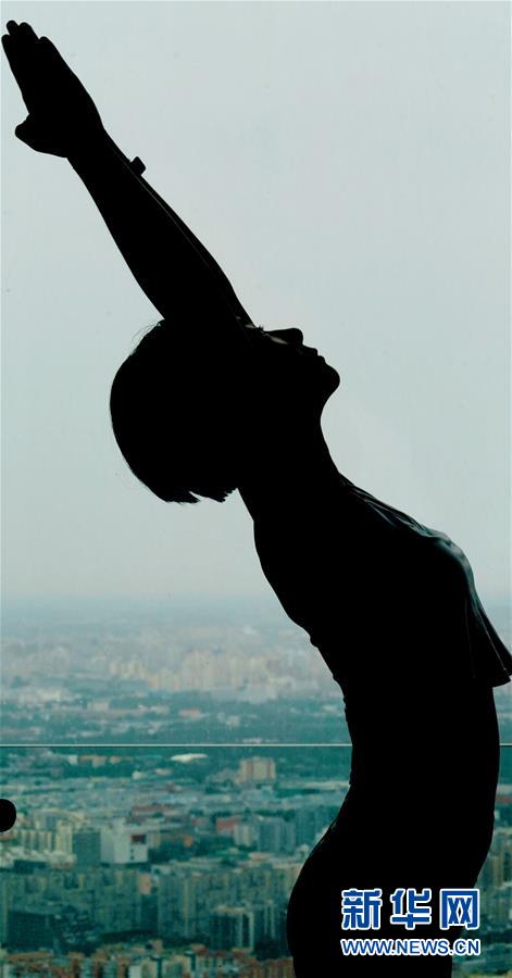 當日,數(shù)名瑜伽愛好者在專業(yè)瑜伽教練的帶領(lǐng)下在北京國貿(mào)大酒店70層以上的高樓層練習瑜伽,體驗高空練習瑜伽的樂趣。