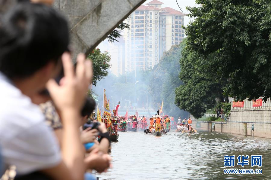 6月14日,觀眾在廣州市天河區(qū)一處河道旁等待龍舟通過。當(dāng)日,廣州市天河區(qū)舉行一場熱鬧歡快的龍舟活動,來自多個村莊“走親戚”的龍舟隊參加。按廣州的傳統(tǒng)習(xí)俗,每年農(nóng)歷五月初一至初五,各村的龍舟隊要到周圍村落“走親戚”。走親戚的龍舟隊到來時,受訪村子要準(zhǔn)備好龍舟飯招待來客?;顒赢?dāng)天,鳴炮敲鑼,一派喜慶氣氛。新華社記者 張加揚(yáng) 攝