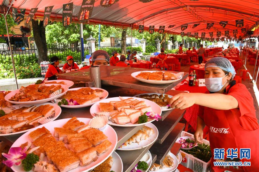 6月14日,工作人員在廣州天河區(qū)珠村七夕廣場準(zhǔn)備龍舟飯。當(dāng)日,廣州市天河區(qū)舉行一場熱鬧歡快的龍舟活動(dòng),來自多個(gè)村莊“走親戚”的龍舟隊(duì)參加。按廣州的傳統(tǒng)習(xí)俗,每年農(nóng)歷五月初一至初五,各村的龍舟隊(duì)要到周圍村落“走親戚”。走親戚的龍舟隊(duì)到來時(shí),受訪村子要準(zhǔn)備好龍舟飯招待來客?;顒?dòng)當(dāng)天,鳴炮敲鑼,一派喜慶氣氛。新華社記者 鄧華 攝