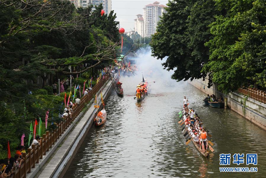 6月14日,多個(gè)村的龍舟隊(duì)在廣州市天河區(qū)一處河道劃龍舟。當(dāng)日,廣州市天河區(qū)舉行一場(chǎng)熱鬧歡快的龍舟活動(dòng),來(lái)自多個(gè)村莊“走親戚”的龍舟隊(duì)參加。按廣州的傳統(tǒng)習(xí)俗,每年農(nóng)歷五月初一至初五,各村的龍舟隊(duì)要到周圍村落“走親戚”。走親戚的龍舟隊(duì)到來(lái)時(shí),受訪村子要準(zhǔn)備好龍舟飯招待來(lái)客?;顒?dòng)當(dāng)天,鳴炮敲鑼,一派喜慶氣氛。新華社記者 鄧華 攝