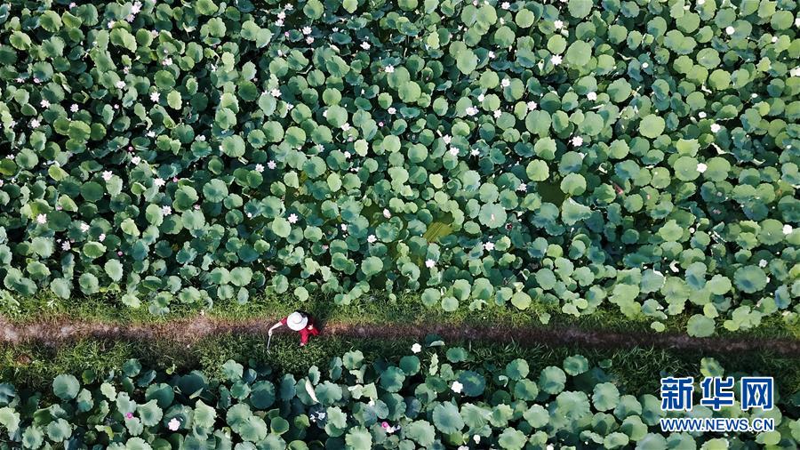 6月14日,游客在銅陵市西湖村荷花園內(nèi)賞荷(無人機(jī)拍攝)。隨著氣溫升高,安徽省銅陵市西聯(lián)鎮(zhèn)西湖村荷花園內(nèi)的300多畝荷花絢麗綻放,吸引游客前來賞荷。 新華社記者 張端 攝