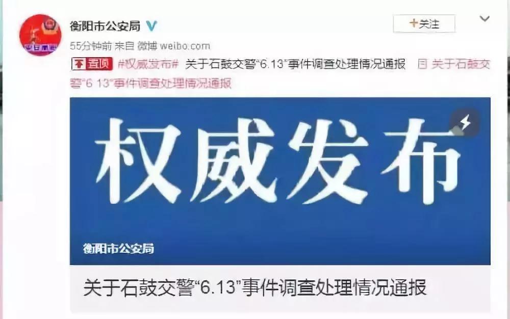 今天,湖南省衡陽(yáng)市公安局官方微博發(fā)布“關(guān)于石鼓交警“6.13”事件調(diào)查處理情況通報(bào)”。