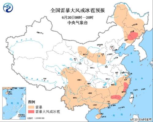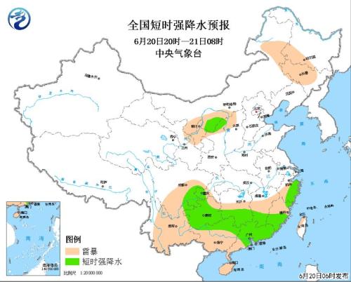 預(yù)計(jì)6月20日08時(shí)到21日08時(shí),貴州、湖南中南部、江西、浙江、福建、廣東中北部、海南東北部、云南西南部等地的部分地區(qū)將有短時(shí)強(qiáng)降水天氣,小時(shí)雨強(qiáng)20-50毫米,局地可達(dá)60毫米以上;另外,內(nèi)蒙古中部和東部、吉林南部、遼寧東北部、浙江南部、福建北部和南部、廣東北部等地局地將有雷暴大風(fēng)或冰雹天氣。
