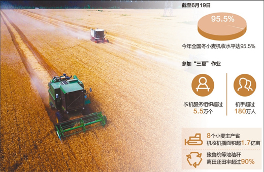 據(jù)農(nóng)業(yè)農(nóng)村部統(tǒng)計(jì),今年全國(guó)參加“三夏”作業(yè)的農(nóng)機(jī)服務(wù)組織預(yù)計(jì)超過(guò)5.5萬(wàn)個(gè),機(jī)手超過(guò)180萬(wàn)人,截至6月19日,全國(guó)冬小麥機(jī)收水平達(dá)到95.5%,8個(gè)小麥主產(chǎn)省機(jī)收、機(jī)播服務(wù)面積超過(guò)1.7億畝。全程機(jī)械化特點(diǎn)明顯,各地主推“一條龍”作業(yè),在搶收小麥的同時(shí),玉米機(jī)播隨即展開,夏收、夏種、夏管這“三夏”正在變成“兩夏”。