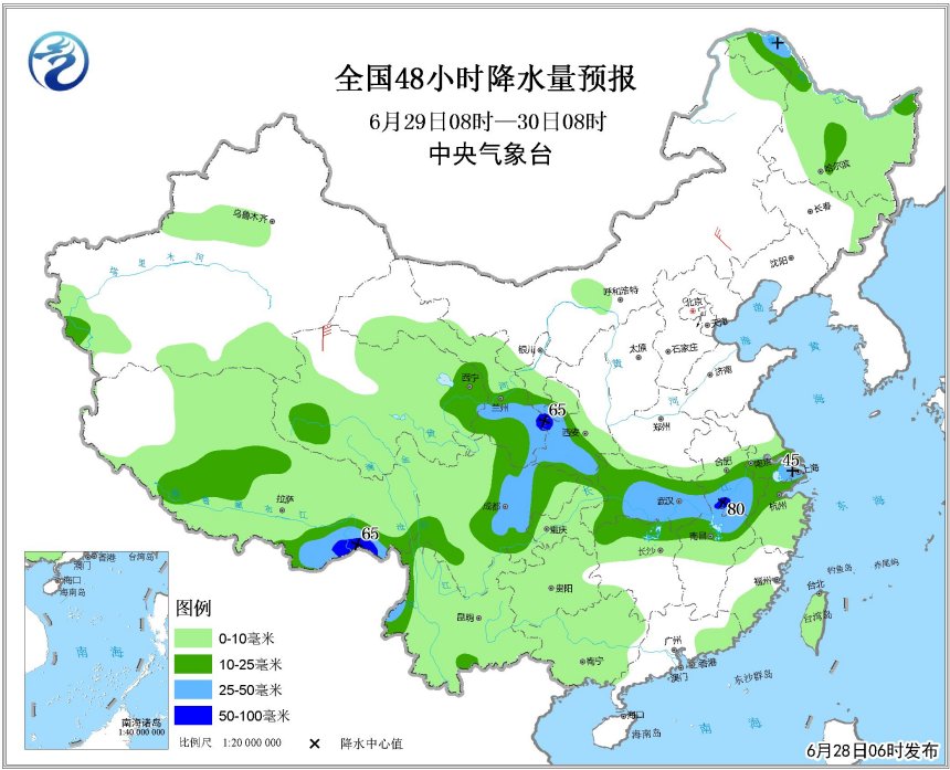 未來,隨著天氣系統(tǒng)的緩慢南壓,主要降水區(qū)還將維持在江淮、江漢、江南北部。6月28日到7月1日,雨帶基本在上述區(qū)域擺動。