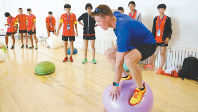 2018年全國(guó)第一期青少年越野滑雪夏令營(yíng)日前在黑龍江省哈爾濱市開營(yíng),圖為教練正在進(jìn)行訓(xùn)練示范。郭傳委攝