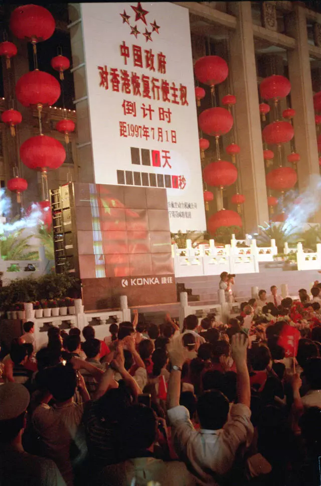 1997年7月1日零點,在天安門廣場參加北京市人民迎接香港回歸祖國聯(lián)歡會的人們觀看香港政權(quán)交接儀式的電視直播。中國政府對香港恢復(fù)行使主權(quán)倒計時牌標出:距1997年7月1日還有零天,零秒。新華社發(fā)