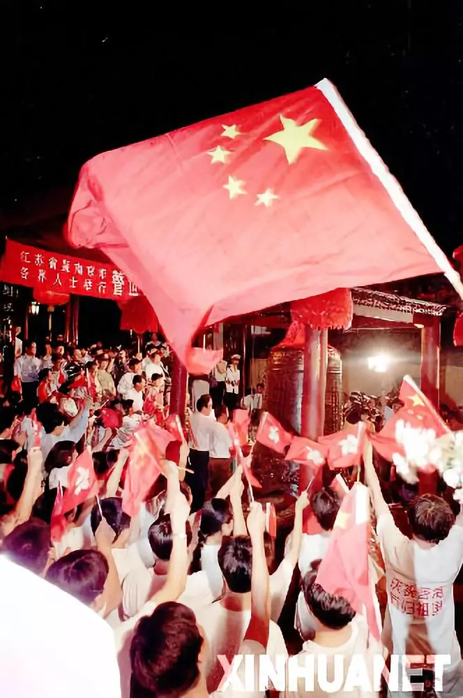 1997年6月30日晚,江蘇省南京市各界群眾代表在當年《南京條約》議約地南京靜海寺舉行撞響“警世鐘”儀式。靜海寺大鐘一共敲響了155下,寓意香港離開祖國155年后又回到祖國的懷抱。新華社 發(fā)