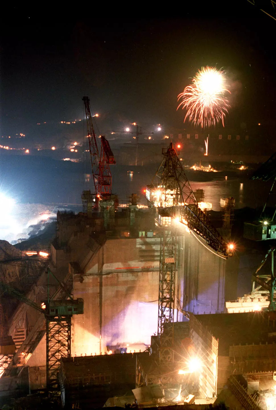 1997年6月30日晚,正在承建三峽工程導(dǎo)流明渠、臨時船閘、大江截流等施工項目的葛洲壩集團公司職工在工地上燃放焰火,慶祝香港回歸。新華社記者 杜華舉 攝