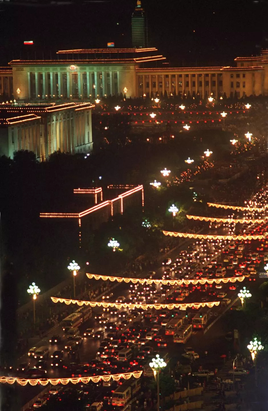 隨著香港回歸祖國日期的臨近,北京各主要街道及建筑物上亮起五光十色的彩燈。市民們扶老攜幼,徜徉在天安門廣場和長安街上,欣賞絢麗多彩的京城美景。這是天安門廣場和東長安街夜景。新華社記者 陳曉華 攝