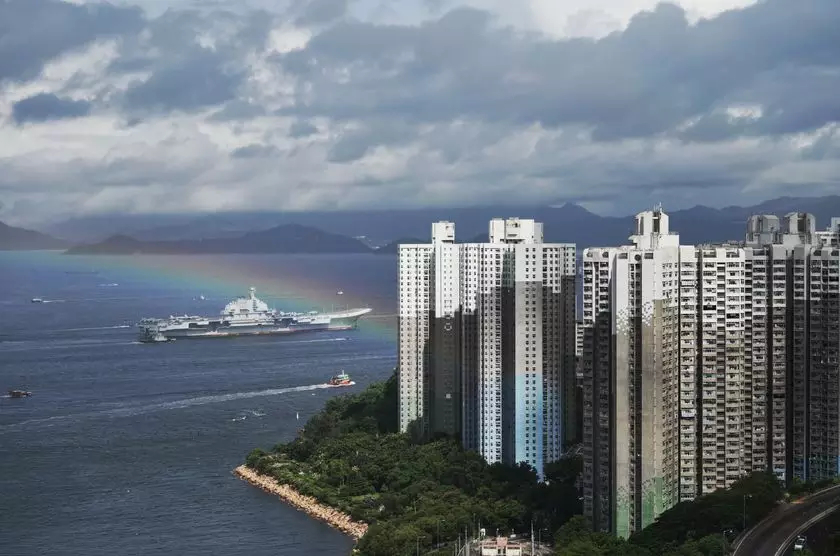 2017年7月7日,海軍遼寧艦在香港南丫島附近航行。當日,正在執(zhí)行跨區(qū)機動訓(xùn)練任務(wù)的中國人民解放軍海軍航母編隊抵達香港,參加香港回歸祖國暨中國人民解放軍進駐香港20周年慶?;顒樱艿较愀厶貐^(qū)政府和民眾熱烈歡迎。 新華社發(fā)(王申攝)