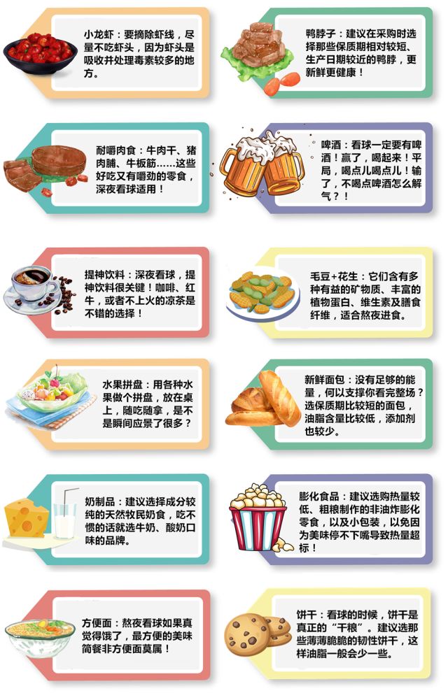 小編溫馨提示:球隊(duì)是別人家的,身體可是咱自己的,“爽了嘴傷了胃”,著實(shí)不劃算。深夜看球,不僅要吃的美味,更要吃的健康!下面為吃貨們送上一份健康飲食攻略圖。