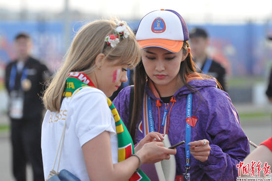 盡管球迷的問題繁多且復(fù)雜,但對(duì)徐琛和田晨而言,在球迷最需要的時(shí)候提供服務(wù),這種成就感可以彌補(bǔ)一些不能走進(jìn)球場的遺憾。田晨發(fā)現(xiàn),相較而言,中國球迷普遍靦腆,很少有人主動(dòng)上前詢問,他們更習(xí)慣于埋著頭用手機(jī)進(jìn)行查詢,為了讓更多中國球迷得到幫助,他和徐琛申請(qǐng)?jiān)诙碚Z、英語之外增加中文廣播,并在證件上貼上了五星紅旗的標(biāo)志,“這樣做的效果好了很多,大家遠(yuǎn)遠(yuǎn)地就會(huì)說有個(gè)中國志愿者,就圍了上來,還主動(dòng)合照?!遍L相甜美且會(huì)四國語言的徐琛,也因此以“世界杯最美中國志愿者”上了熱搜,每次有中國球迷走過來,其他志愿者就會(huì)跟她說:“你的中國朋友又來找你了?!?/p>