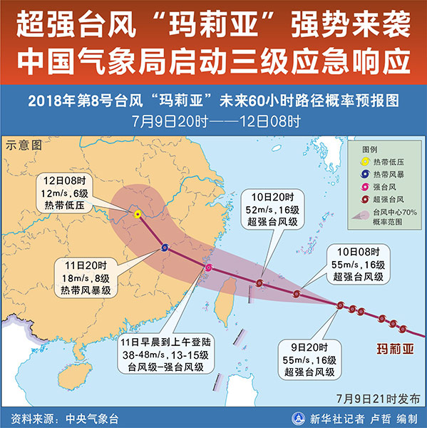 中央氣象臺(tái)預(yù)報(bào),今年第8號超強(qiáng)臺(tái)風(fēng)“瑪莉亞”中心9日8時(shí)位于臺(tái)灣省宜蘭縣東偏南方約1260公里的西北太平洋洋面上。預(yù)計(jì)將以每小時(shí)30公里左右的速度向西偏北方向移動(dòng),逐漸向臺(tái)灣以東洋面靠近,將于10日夜間登陸或擦過臺(tái)灣東北部,并于11日早晨到上午在福建晉江到浙江溫州之間沿海再次登陸。登陸后繼續(xù)向西北方向移動(dòng),強(qiáng)度逐漸減弱。
