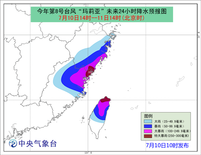 降水預(yù)報:10日14時至11日14時,浙江東部和南部、福建中北部、臺灣島中北部有大雨或暴雨,其中,福建東北部、浙江東南部、臺灣島北部等地的部分地區(qū)有大暴雨、局地特大暴雨(250-300毫米)。