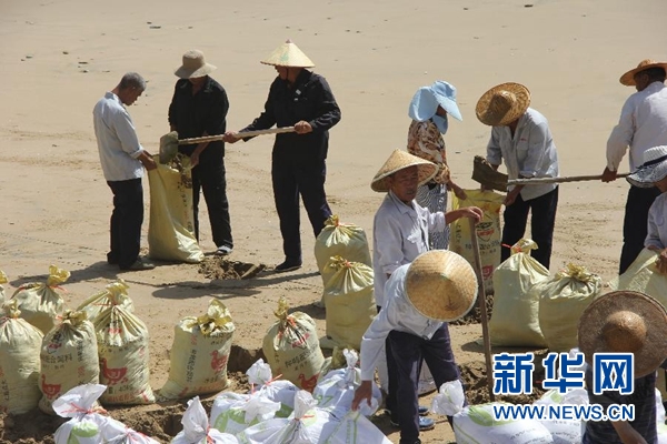 7月10日,在浙江省溫嶺市石塘鎮(zhèn)金沙灘,景區(qū)工作人員在進(jìn)行加固堤壩作業(yè)。新華社發(fā)(金云國(guó) 攝)