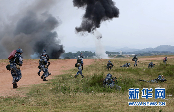 紅藍對抗中,殲“敵”信號發(fā)射后,“紅軍”主攻隊在模擬連連長指揮下,按照戰(zhàn)術編組發(fā)起進攻(資料照片)。新華社發(fā)(姚立 攝)