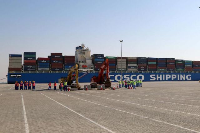 ↑2017年11月5日在阿聯(lián)酋拍攝的中遠(yuǎn)海運港口阿布扎比碼頭正式動工暨場站租賃簽約儀式現(xiàn)場。 新華社記者蘇小坡攝