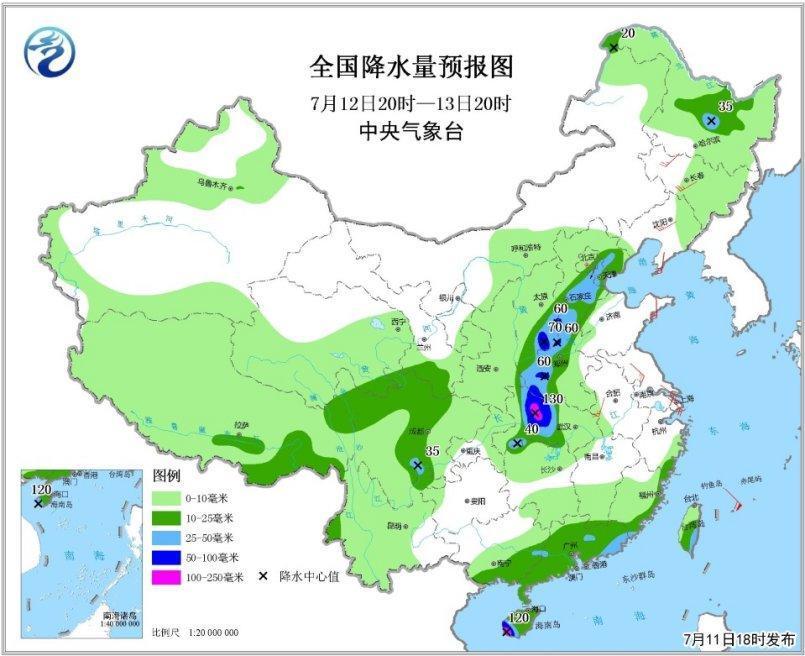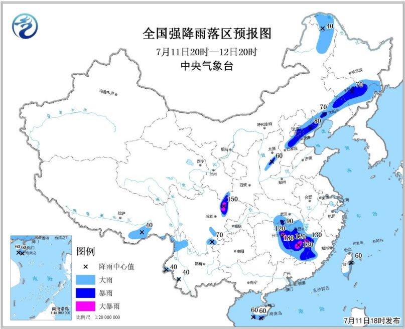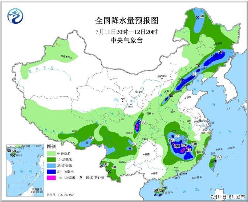 預(yù)計(jì)7月11日20時至12日20時,福建西部、江西、湖南東部、湖北東南部、四川盆地西北部和南部、山西中部、河北中部和東北部、北京東南部、天津中北部、遼寧西部和北部、吉林中東部以及海南島南部、云南西部等地有大雨或暴雨,其中,江西中部、湖南東北部、四川盆地西北部等地的局部地區(qū)有大暴雨(100~180毫米);上述地區(qū)最大小時降水量30~50毫米,局地60毫米以上(見圖1)。中央氣象臺7月11日18時繼續(xù)發(fā)布暴雨黃色預(yù)警。