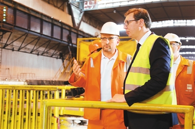 塞爾維亞總統(tǒng)武契奇7月5日出席河鋼塞爾維亞有限公司為正式接管斯梅代雷沃鋼鐵廠兩周年舉行的慶典時表示,中國公司的收購讓該廠獲得成功和進步。斯梅代雷沃鋼鐵廠成立于1913年,曾一度面臨倒閉。2016年,中國河鋼集團收購該廠。當年底,實現(xiàn)盈利。圖為武契奇(右)視察河鋼塞爾維亞有限公司。新華社記者 王慧娟攝