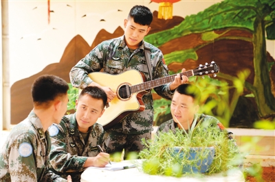 在聯(lián)合國馬里多層面綜合穩(wěn)定團東戰(zhàn)區(qū)超級營地中國維和營內,有一支由中國第5批赴馬里維和部隊組成的“藍音樂隊”?!八{音樂隊”成員個個都是任務一線的骨干力量,經歷過生死考驗之后,更加懂得生命的意義。圖為2018年5月12日,“藍音樂隊”成員交流歌曲心得。韓立建攝(新華社發(fā))