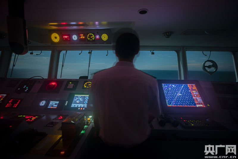 “也是為了防范電子設(shè)備出現(xiàn)意外嘛。”除了各類(lèi)儀表的光,駕駛臺(tái)里幾乎是漆黑一片。趕在天黑前,三副身后的黑色幕簾被死死拉嚴(yán),沒(méi)留一點(diǎn)縫隙。