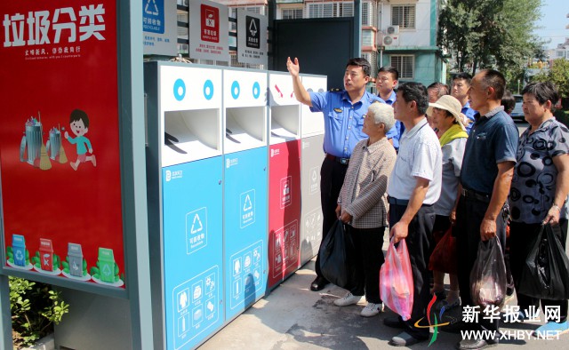 2018年7月13日,宿遷市宿豫區(qū)城管局的城管人員正在“垃圾分類(lèi)站”現(xiàn)場(chǎng)引導(dǎo)居民分類(lèi)、投放垃圾。孫東城 攝 視覺(jué)江蘇網(wǎng)供圖