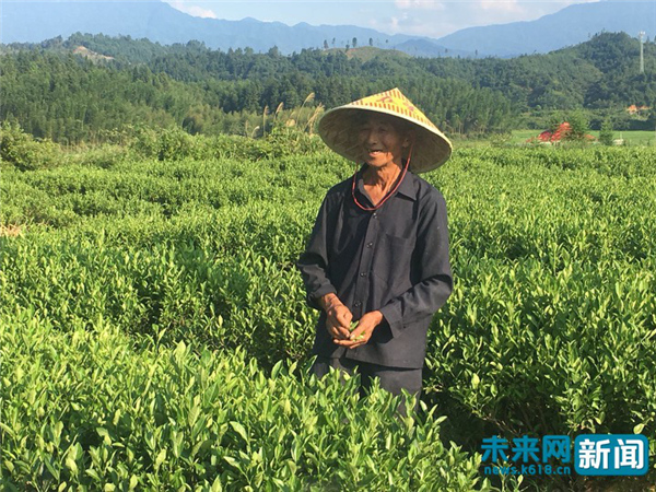 村民在井岡山新城鎮(zhèn)黃金茶基地采茶,說起收入非常開心。未來網(wǎng)記者 楊佩穎攝。