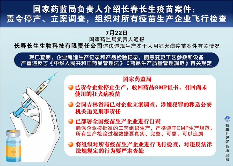 新華社北京7月22日電(記者齊中熙、趙文君)國家藥監(jiān)局負(fù)責(zé)人22日通報(bào)長春長生生物科技有限責(zé)任公司違法違規(guī)生產(chǎn)凍干人用狂犬病疫苗案件有關(guān)情況。這位負(fù)責(zé)人說,國家藥監(jiān)局已責(zé)令企業(yè)停止生產(chǎn),收回藥品GMP證書,同時(shí)會同吉林省局已對企業(yè)立案調(diào)查,涉嫌犯罪的移送公安機(jī)關(guān)追究刑事責(zé)任。國家藥監(jiān)局將組織對所有疫苗生產(chǎn)企業(yè)進(jìn)行飛行檢查,對違反法律法規(guī)規(guī)定的行為要嚴(yán)肅查處。