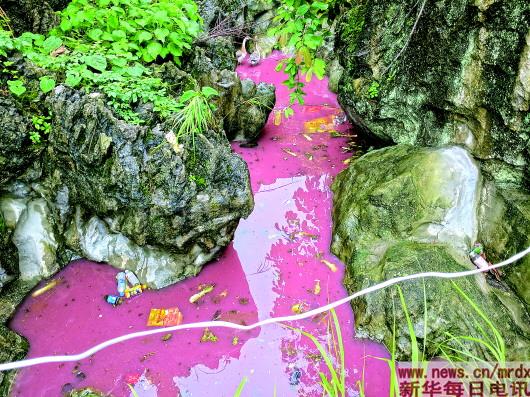 公路邊的一處水池因為種植戶傾倒的火龍果而變成了粉色。本報記者張典標(biāo)攝