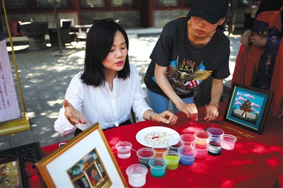今年6月29日,西城區(qū)非物質(zhì)文化遺產(chǎn)保護(hù)中心,非遺傳承志愿者為市民介紹彩砂工藝。當(dāng)天,西城區(qū)啟動(dòng)非遺項(xiàng)目傳承志愿者招募活動(dòng)?;顒?dòng)共設(shè)5個(gè)項(xiàng)目,包括木板年畫、京作核雕等。資料圖片/新京報(bào)記者 王嘉寧 實(shí)習(xí)生 梁思成 攝