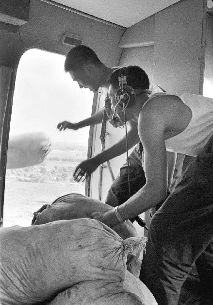 人民解放軍把祖國(guó)各地人民支援災(zāi)區(qū)的抗震救災(zāi)物資,空投給災(zāi)區(qū)人民群眾。(1976年8月1日發(fā))新華社記者 韓曉華 攝