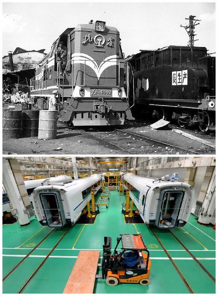 拼版照片:上圖:抗震號(hào)機(jī)車(資料圖片);下圖:2016年7月22日拍攝的中車唐山公司總裝車間一角(新華社記者 牟宇 攝)。