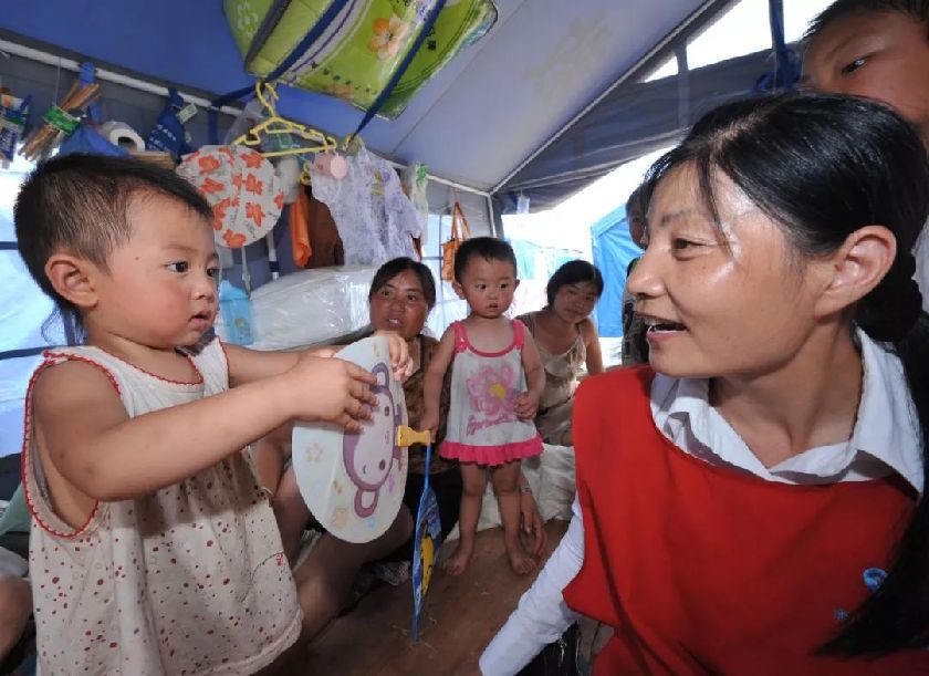 2008年6月10日,董惠娟(右)在為綿竹市一名小朋友進(jìn)行心理疏導(dǎo)。新華社記者 楊俊江 攝