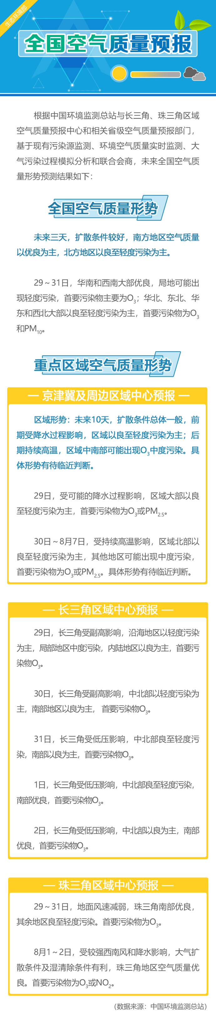 據(jù)生態(tài)環(huán)境部官方微博消息,未來3天(7月29-31日),擴散條件較好,南方地區(qū)空氣質(zhì)量以優(yōu)良為主,北方地區(qū)以良至輕度污染為主。