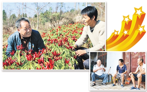 左上圖 張東堂(左)在貧困戶家的辣椒地里查看辣椒長勢?!∮蚁聢D 張東堂(左一)來到貧困戶家中家訪。 經(jīng)濟(jì)日報-中國經(jīng)濟(jì)網(wǎng)記者 郭靜原攝