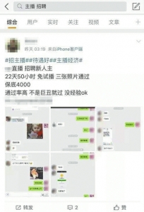 各大直播平臺上土豪也非常多,動不動就幾萬幾十萬地打賞。這些給了愛美且渴望鮮花和掌聲的女孩子一夜爆紅的不切實際的幻想。打開任意一個社交軟件,搜索“主播招聘”會立刻彈出上萬條信息,其中不乏“月入上萬不是夢”“管吃管住,不是巨丑就過”這樣極具吸引力的條件。