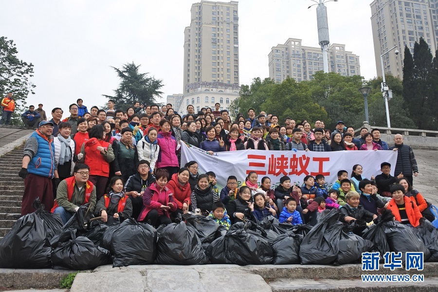 2016年12月3日,“三峽蟻工”志愿者在撿拾的垃圾前合影。2016年10月,在李年邦的發(fā)起下,“三峽蟻工”志愿者組織正式成立,300多名固定成員成為長江垃圾清理的主力軍,他們以“保護(hù)長江母親河”為口號,每逢周末和法定節(jié)假日都會自發(fā)組織在長江岸邊撿拾垃圾。 新華社記者 王自宸 攝