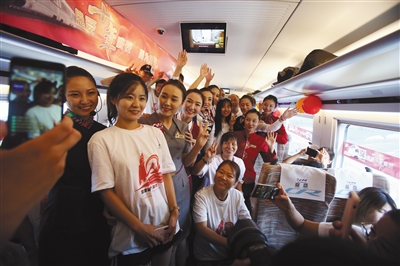 8月1日,乘客與乘務員在京津城際復興號列車內(nèi)合影。新京報記者 王貴彬 攝