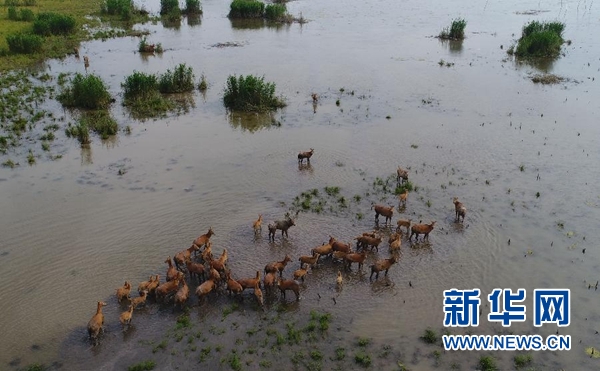 一群自然野化的麋鹿在湖南東洞庭國家級自然保護區(qū)內(nèi)活動(2017年5月10日無人機拍攝)。 新華社記者 李尕 攝