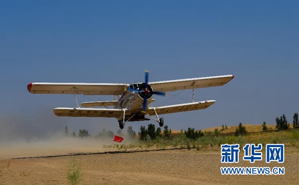 在內(nèi)蒙古鄂爾多斯市的庫布其沙漠腹地,一架飛播造林用的飛機(jī)起飛(7月11日攝)。 新華社記者 彭源 攝