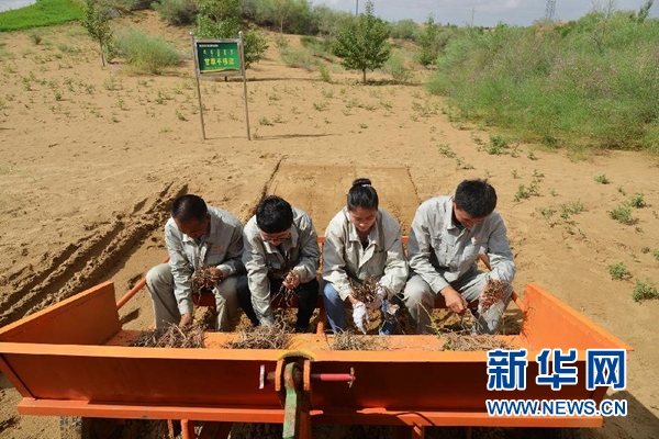 張吉樹介紹說,甘草適合在沙漠里生長,固氮量大,改良沙土的效果很明顯,讓甘草躺著長,可將一棵甘草的治沙面積由0.1平方米擴(kuò)大到1平方米,這項技術(shù)已推廣到其他沙區(qū),治理面積達(dá)220萬畝。