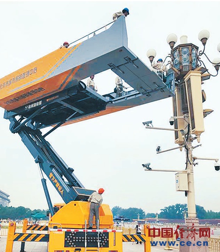 華燈車在檢修和清洗華燈。經(jīng)濟日報-中國經(jīng)濟網(wǎng)記者 常 理攝