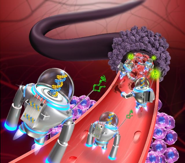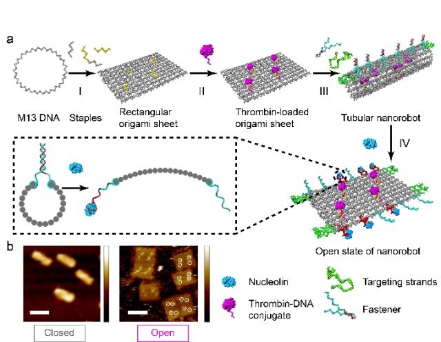 該團隊的丁寶全研究員通過精準(zhǔn)控制,將一種包含7000多個堿基的噬菌體的DNA單鏈分子折成長方形板,放上四個“殺手”——凝血酶分子,然后再將其卷起來,接口處安裝用核仁素DNA片段做的“鎖”,最終形成90納米長、直徑為19納米的管狀機器人。