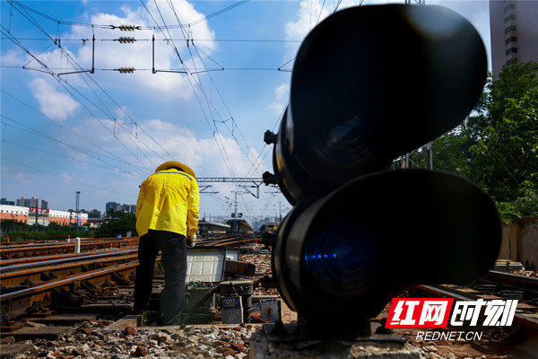 中國鐵路廣州局集團有限公司長沙電務段員工們不畏高溫,堅守在鐵路一線,作業(yè)人員正在對道岔設備進行調試。