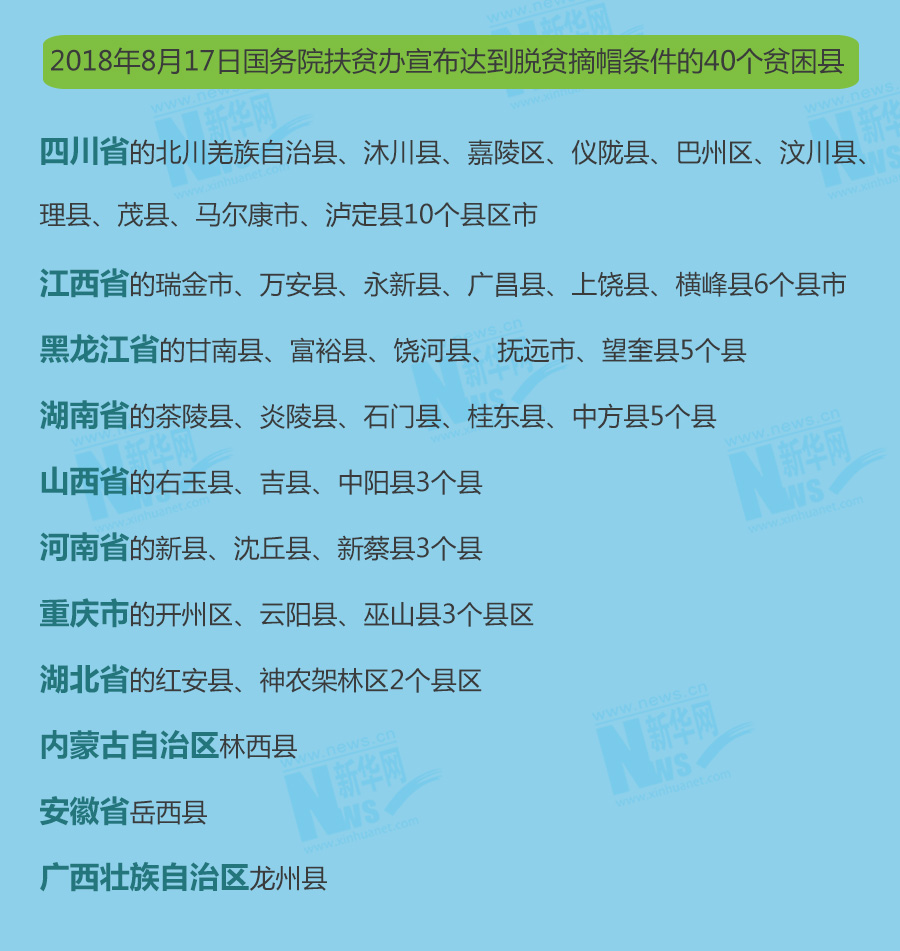 國務院扶貧辦副主任夏更生表示,此次實現(xiàn)脫貧的40個縣是:四川省的北川羌族自治縣、沐川縣、嘉陵區(qū)、儀隴縣、巴州區(qū)、汶川縣、理縣、茂縣、馬爾康市、瀘定縣10個縣區(qū)市,江西省的瑞金市、萬安縣、永新縣、廣昌縣、上饒縣、橫峰縣6個縣市,黑龍江省的甘南縣、富??h、饒河縣、撫遠市、望奎縣5個縣,湖南省的茶陵縣、炎陵縣、石門縣、桂東縣、中方縣5個縣,山西省的右玉縣、吉縣、中陽縣3個縣,河南省的新縣、沈丘縣、新蔡縣3個縣,重慶市的開州區(qū)、云陽縣、巫山縣3個縣區(qū),湖北省的紅安縣、神農(nóng)架林區(qū)2個縣區(qū),內(nèi)蒙古自治區(qū)林西縣,安徽省岳西縣,廣西壯族自治區(qū)龍州縣。