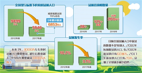 在以習(xí)近平同志為核心的黨中央堅強(qiáng)領(lǐng)導(dǎo)下,脫貧攻堅力度之大、規(guī)模之廣、影響之深前所未有。經(jīng)過幾年的努力,脫貧攻堅取得決定性進(jìn)展:全國現(xiàn)行標(biāo)準(zhǔn)下的農(nóng)村貧困人口由2012年底的9899萬人,減少到2017年底的3046萬人,5年累計脫貧6853萬人,減貧幅度達(dá)到70%左右。貧困發(fā)生率由2012年底的10.2%下降到2017年底的3.1%。貧困縣數(shù)量實現(xiàn)了首次減少,2016年有28個貧困縣脫貧摘帽,2017年有125個貧困縣申請摘帽,今年計劃200多個縣摘帽,解決區(qū)域性整體貧困邁出堅實步伐。貧困地區(qū)群眾生產(chǎn)生活條件明顯改善,貧困群眾收入水平明顯提高、獲得感明顯增強(qiáng)。
