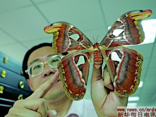 有人害怕蝴蝶和蛾子,以為它們翅膀表面的鱗片有毒。趙力解釋說,其實(shí)那些鱗片和頭發(fā)的成分一樣,人接觸了以后并不會(huì)有不良反應(yīng)。